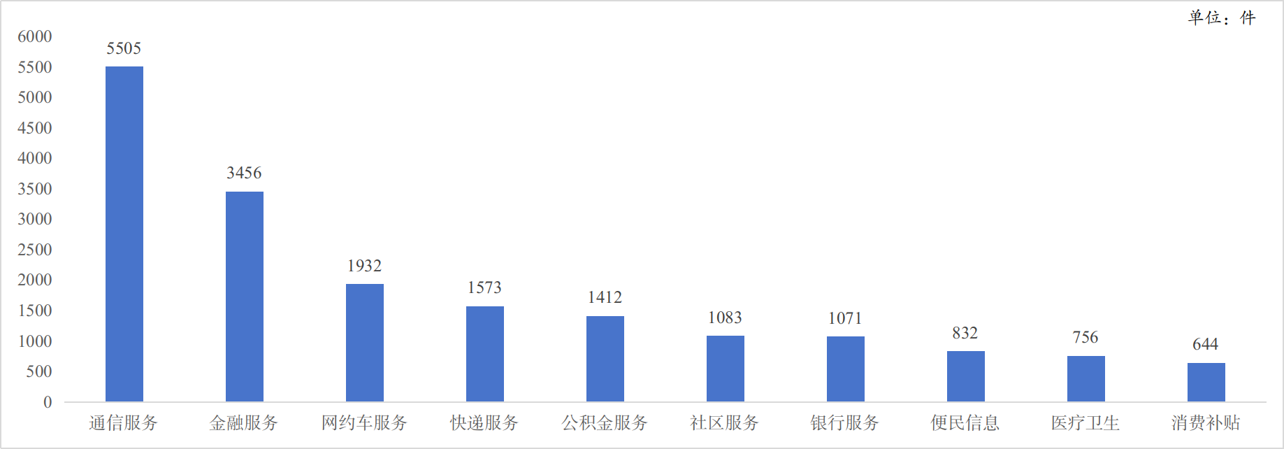 市政府各部门、有关单位办理诉求热点分析:群众诉求主要集中在通信服务(5505件)、金融服务(3456件)、网约车服务(1932件)、快递服务(1573件)、公积金服务(1412件)、社区服务(1083)、银行服务(1071件)、便民信息(832件)、医疗卫生(756件)、消费补贴(644件)等方面。