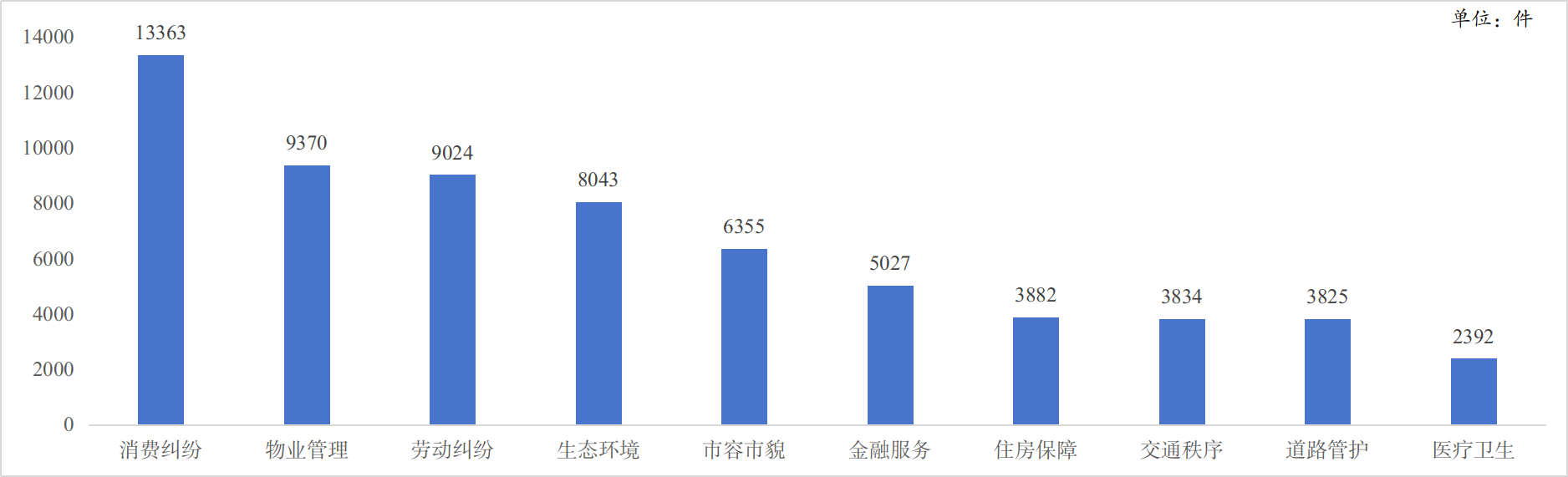 各区县(自治县)和西部科学城重庆高新区、万盛经开区办理诉求热点分析:群众诉求主要集中在消费纠纷(13363件)、物业管理(9370件)、劳动纠纷(9024件)、生态环境(8043件)、市容市貌(6355件)、金融服务(5027件)、住房保障(3882件)、交通秩序(3834件)、道路管护(3825件)、医疗卫生(2392件)等方面。