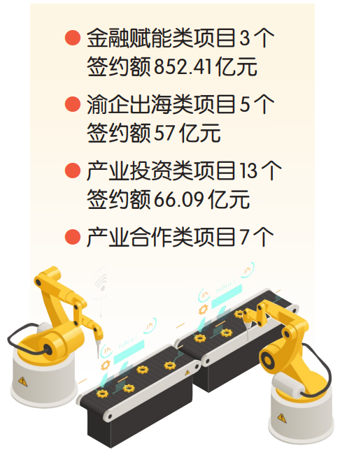 合作成果集中兑现,签约现场热度高涨。其中,金融赋能类项目3个,签约额852.41亿元——中信银行将为重庆市新能源汽车行业提供750亿元授信,全力支持重庆智能网联新能源汽车之都建设,同时组建专精特新基金,引入“耐心资本”“长期资本”助力新质生产力培育;渝企出海类项目5个,签约额57亿元;产业投资类项目13个,签约额66.09亿元;产业合作类项目7个。