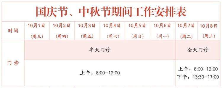 10月1日—6日为半天门诊,10月7日、8日为全天门诊,节假日期间,急诊、发热门诊24小时照常开放。