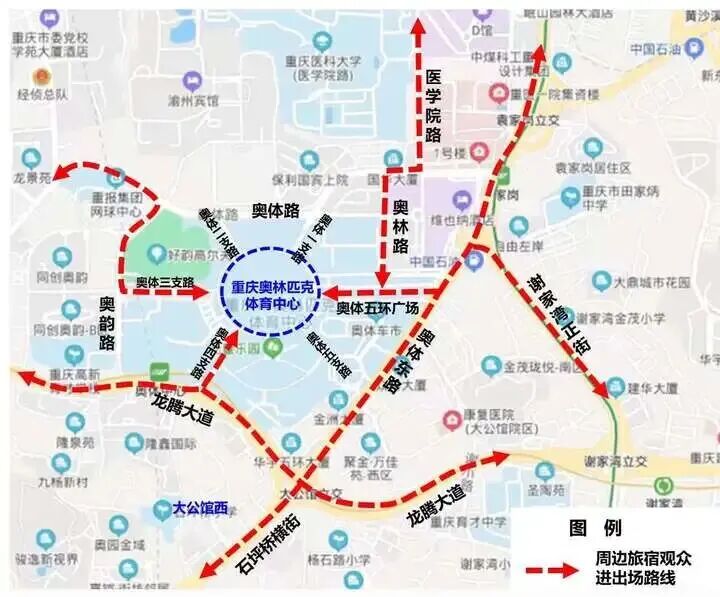 三、公安交通管理部门将在3月28日、29日每天17:00-19:00,21:30-23:00(进散场高峰时段)对奥林一支路、奥林二支路(现处于施工阶段)实施临时交通管制,禁止所有车辆通行;在中新城上城停放的车辆可从奥林路出口驶出,经由奥体路往袁家岗方向行驶。