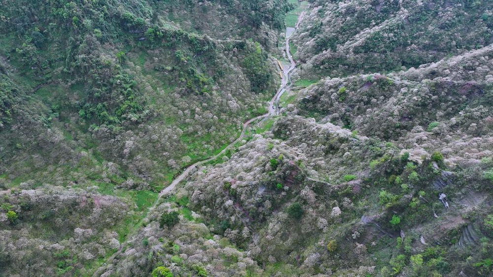 在可大乡可大村桐花岭,万亩桐花正值盛放期。小喇叭状的单层五瓣花挂满枝头,五六朵依偎成一簇,红色的花蕊点缀着洁白花瓣,花香含蓄而悠远。从空中俯瞰,连绵起伏的山峦被油桐花装点成一片片白色花海,犹如铺上一层薄雪,整个山峰仿佛进入浪漫的童话世界。
