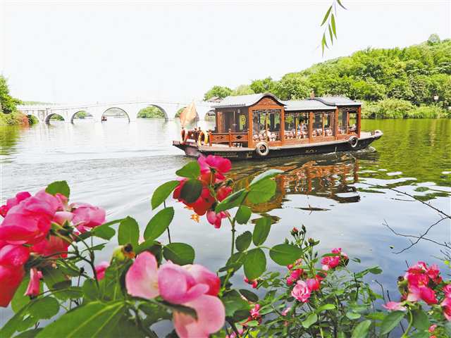 5月3日,游客乘坐游船在重庆园博园游览。新华社发(邓良奎 摄)