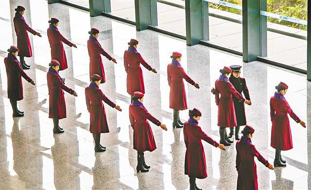 1月7日,重庆西站,重庆客运段动车四队乘务员正在进行服务礼仪培训。春运临近,重庆客运段组织动车组乘务员开展各类培训、应急技能演练等,以为乘客提供更好的服务,确保春运期间平稳安全有序。