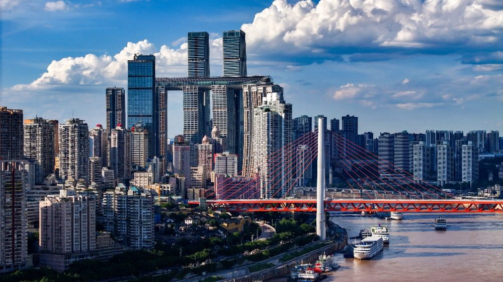 连日来,重庆中心城区碧空如洗,湛蓝澄澈。朵朵白云轻盈游弋,与城市叠嶂的楼影相映成趣。