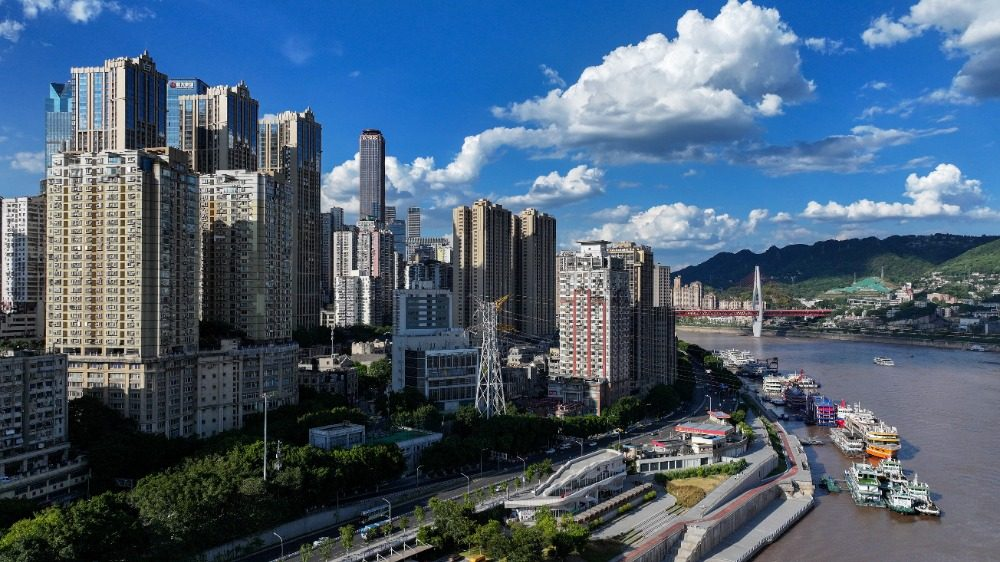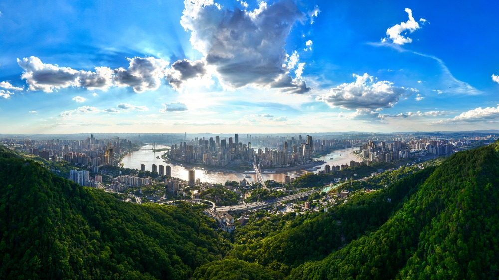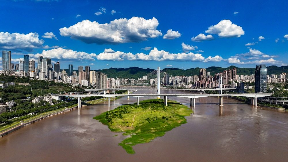 8月27日,蓝天白云下的重庆城区(无人机照片)。记者 尹诗语 摄