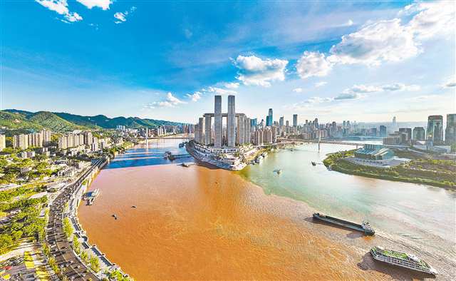 8月27日,朝天门码头两江交汇处,长江与嘉陵江水色泾渭分明,宛如一口巨大的“鸳鸯锅”。在蓝天白云的映衬下,这里成为重庆独特的风景线,吸引了众多游客前来观赏(无人机照片)。