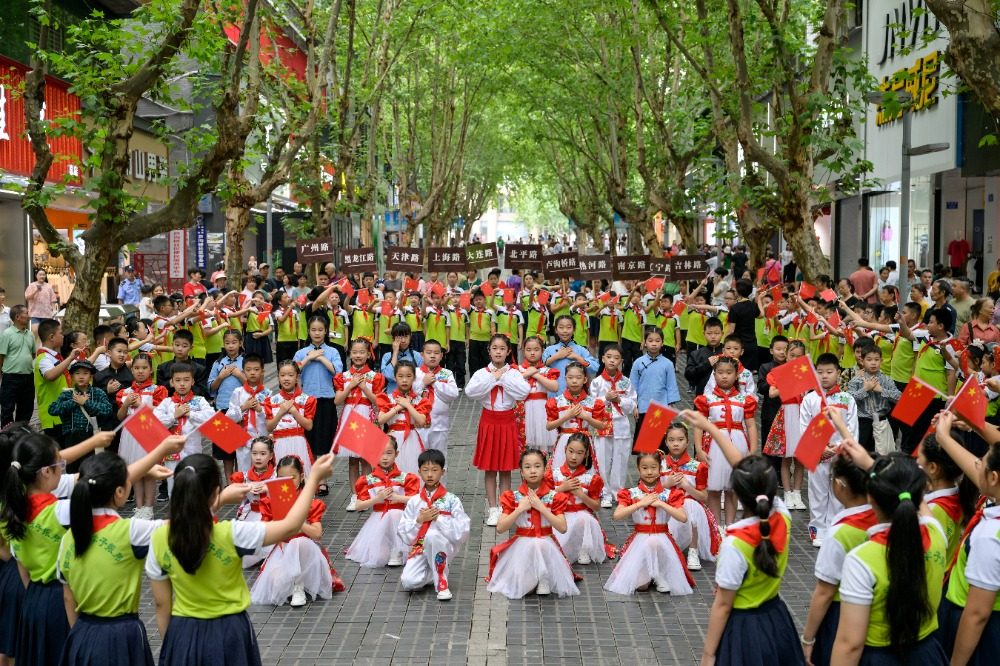 2025年9月1日,北碚区朝阳街道中山路,来自中山路小学的学生们表演情景剧《梧桐树下的路》,作为开学的第一课。记者 张春晓 摄