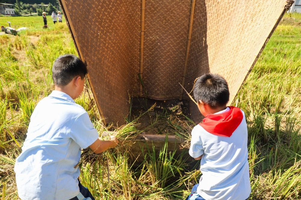 9月1日,云阳县路阳小学学生们正在体验用半桶打谷子。通讯员 谭启云 摄