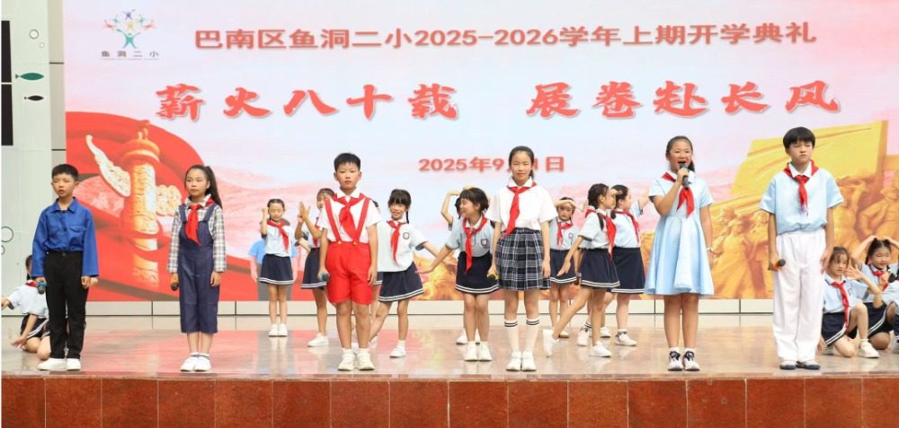 9月1日,巴南区鱼洞第二小学校,学生们带来《薪火八十载 展卷赴长风》为主题的节目表演。特约摄影 李攀