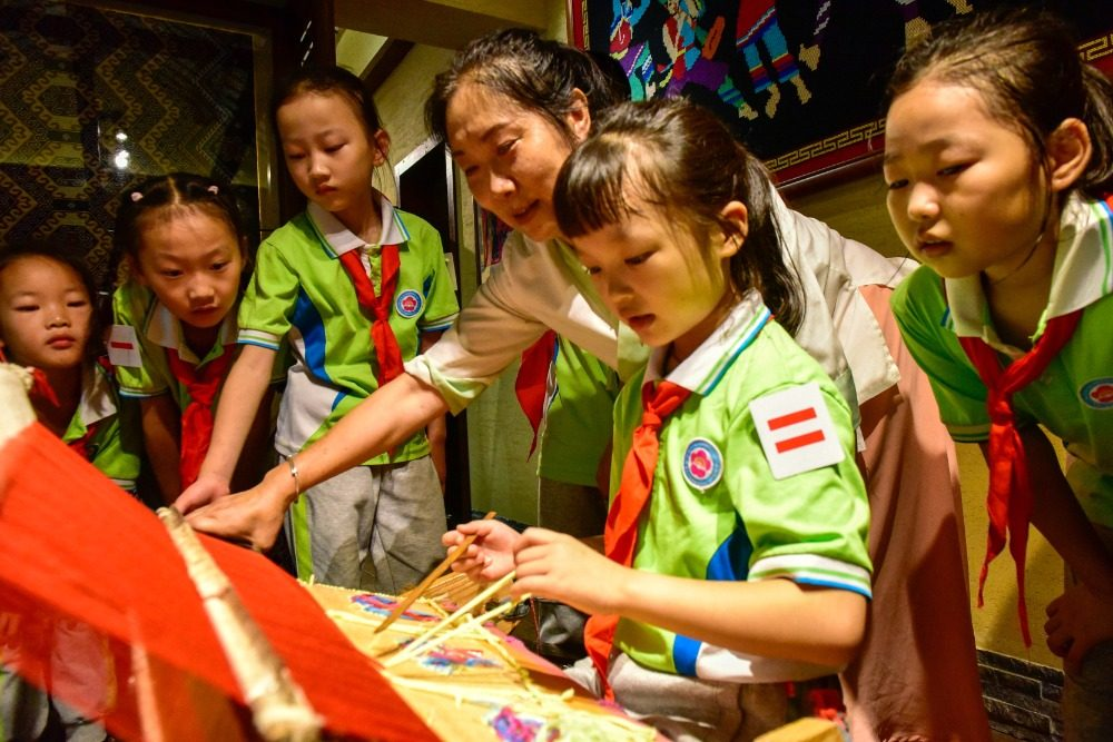 9月1日,酉阳县桃花源景区非遗织锦工坊,非遗技艺大师正在给桃花源小学的学生们上“开学第一课”——学织非遗“土家织锦”。特约摄影 邱洪斌