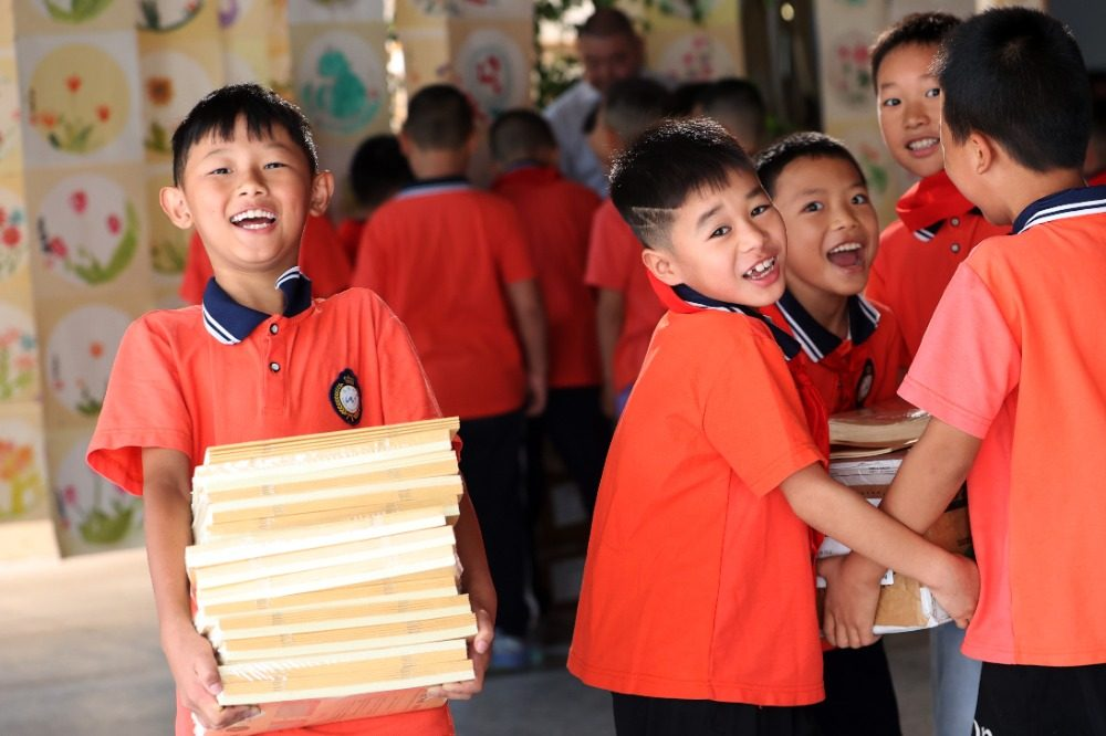 9月1日,黔江区武陵小学二年级学生在领取新书。特约摄影 杨敏