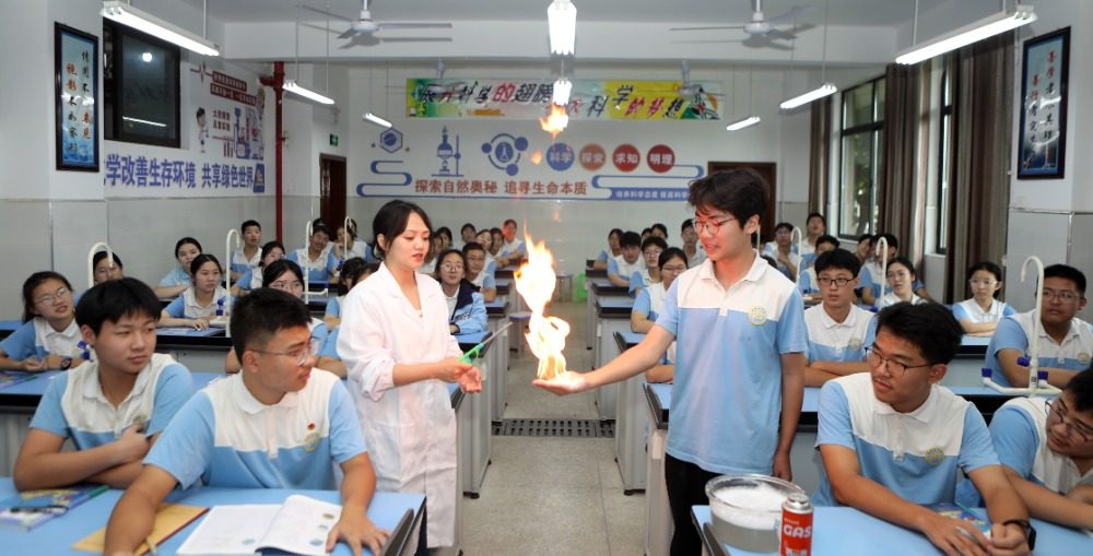 9月1日,永川区,凤凰湖中学学生在化学课堂上体验火焰在掌心跳跃。特约摄影 陈仕川