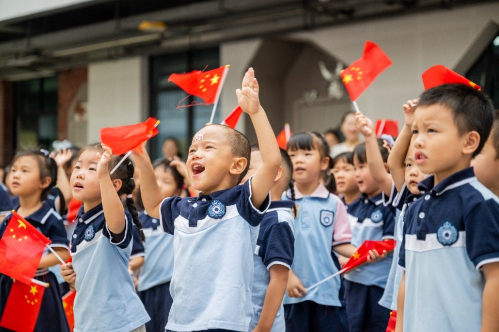 9月1日,大渡口区实验幼儿园,开学典礼现场,孩子们在国旗下欢呼。通讯员 刘映呈 摄