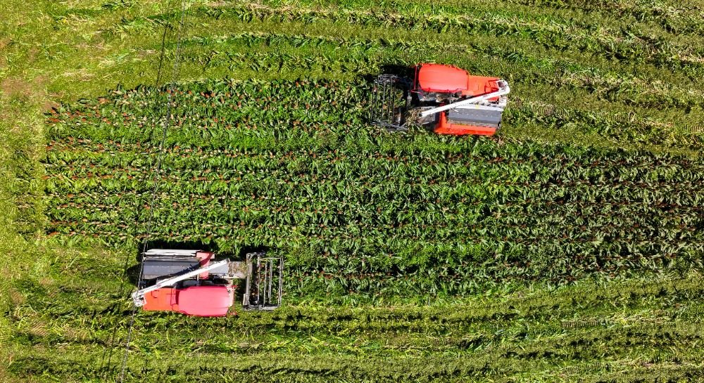 9月15日,垫江县新民镇恬园山庄,农机把收获的高粱装车(无人机照片)。
