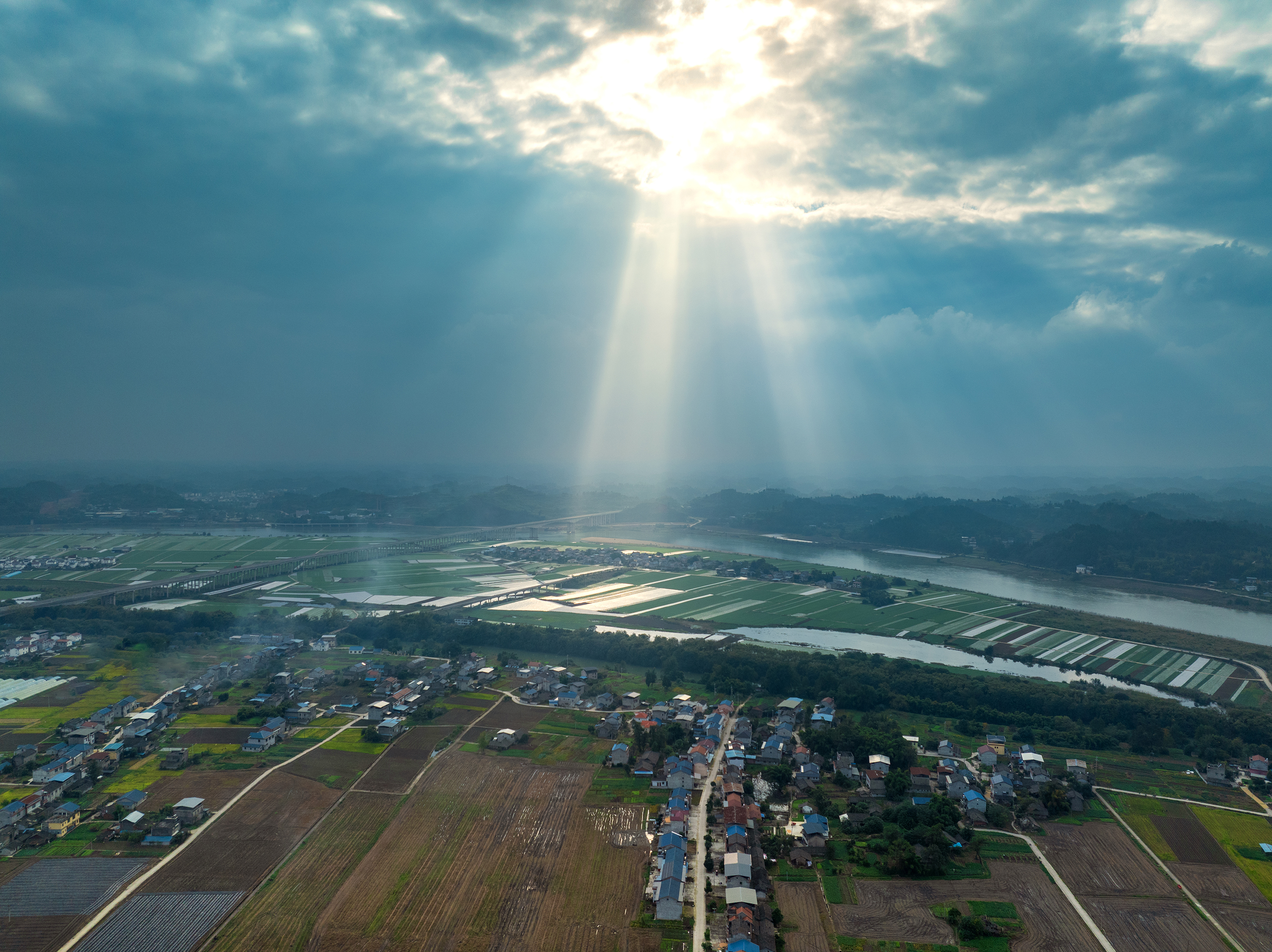 11月4日,阳光穿透云层照在潼南区桂林街道八角村,土壤干湿度正适合油菜播种(无人机照片)。记者 张春晓 摄