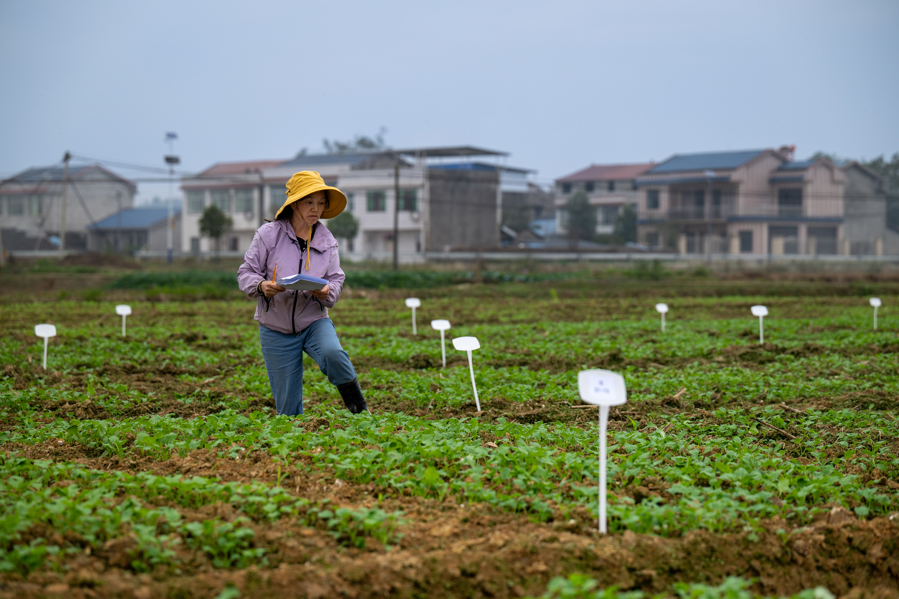 2025年11月4日,潼南区桂林街道八角村重庆市现代种业创新基地内,科研人员在查看油菜幼苗生长情况。记者 张春晓 摄