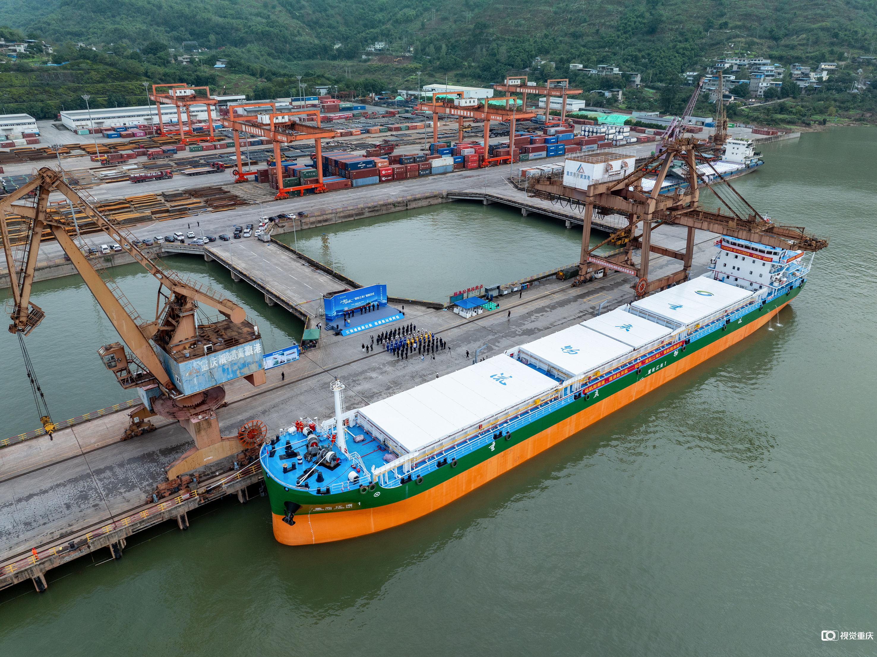 11月11日,涪陵区黄旗港,重庆市首艘130米LNG江海直达船“重轮江海1”首航仪式(无人机照片)。记者 张春晓 摄