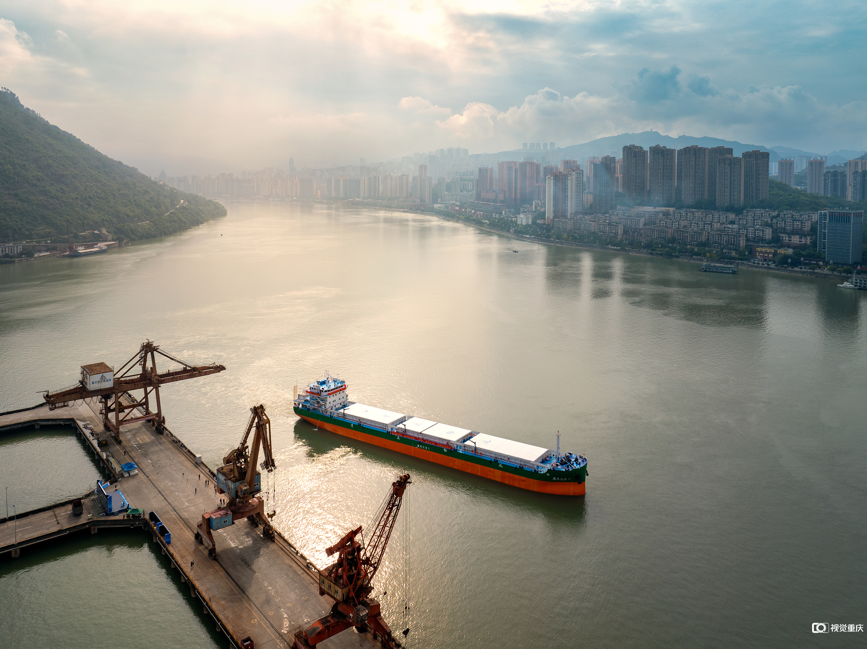 11月11日,涪陵区黄旗港,重庆市首艘130米LNG江海直达船“重轮江海1”首航前停靠在涪陵区黄旗港(无人机照片)。记者 张春晓 摄