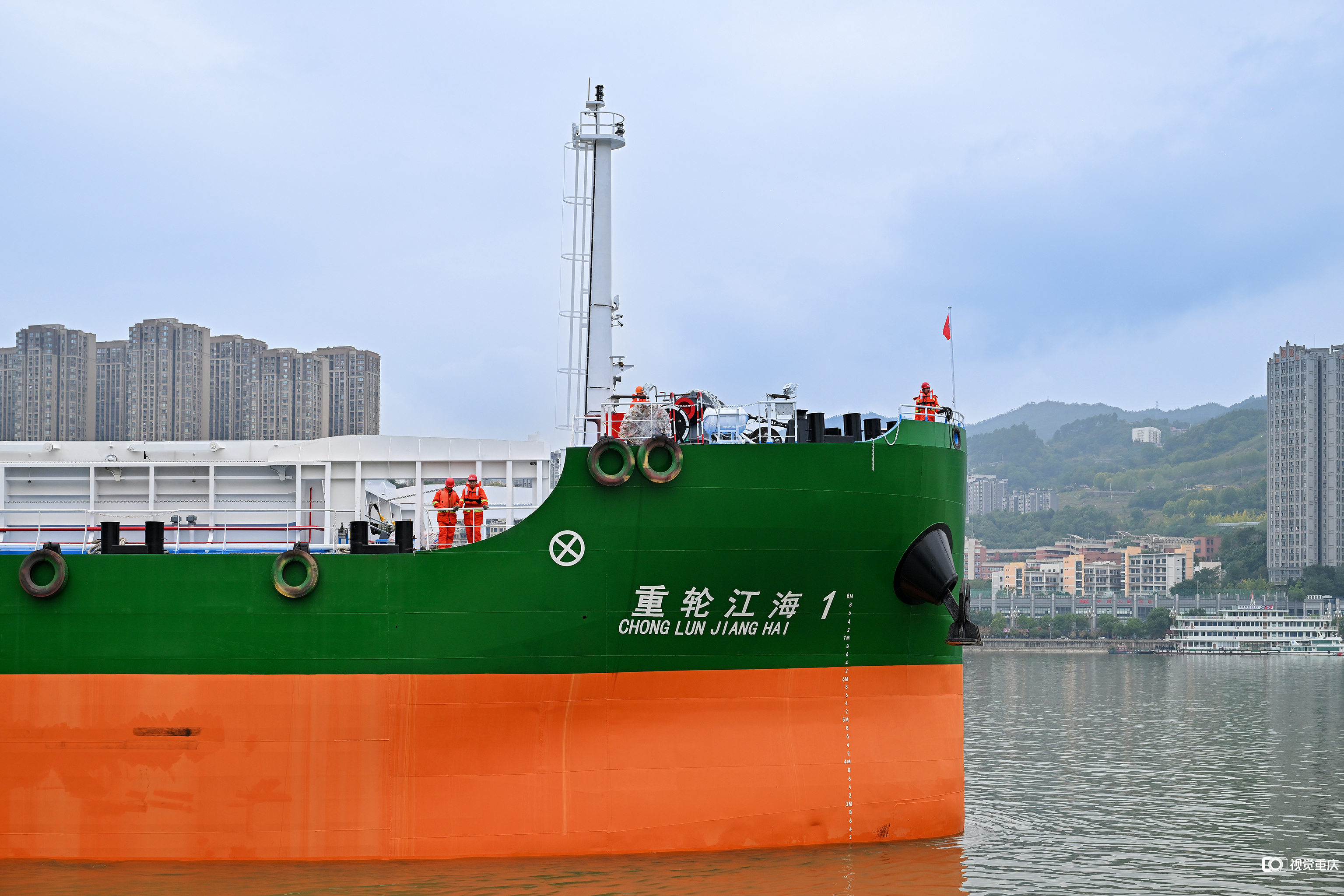 “重轮江海1”是重庆市第一艘江海直达船舶,由重庆轮船(集团)有限公司所有,中国船级社重庆分社负责建造检验,重庆中江船业有限公司施工建造。船舶总长130米,型宽16.2米,型深8.85米,受载1万吨。作为一艘采用LNG单一燃料的先进船舶,“重轮江海1”实现了从长江到海洋全程的“近零”硫氧化物和颗粒物排放,同时大幅降低碳排放,安全性、经济性、环保性均达到国内乃至国际先进水平。不但实现了通江达海的无缝衔接,提升了西南地区与沿海港口之间的物流效率,降低了转运成本。同时也标志着涪陵乃至西南地区的船舶工业,在高端、绿色、智能江海直达船舶的建造能力上实现了新突破。