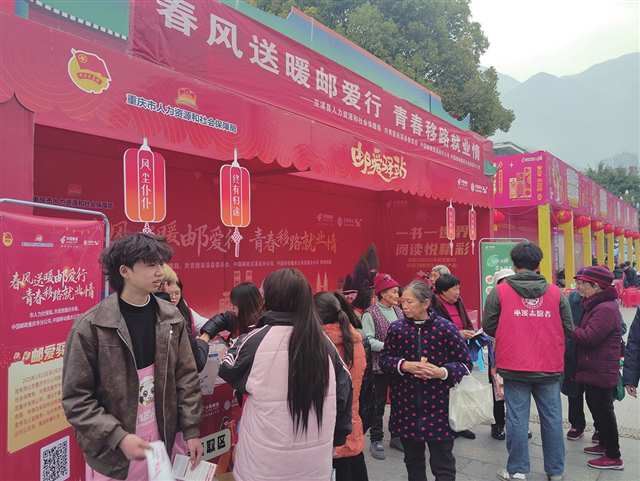 巫溪县邮爱驿站,返乡的农民工们领取礼品、咨询就业岗位