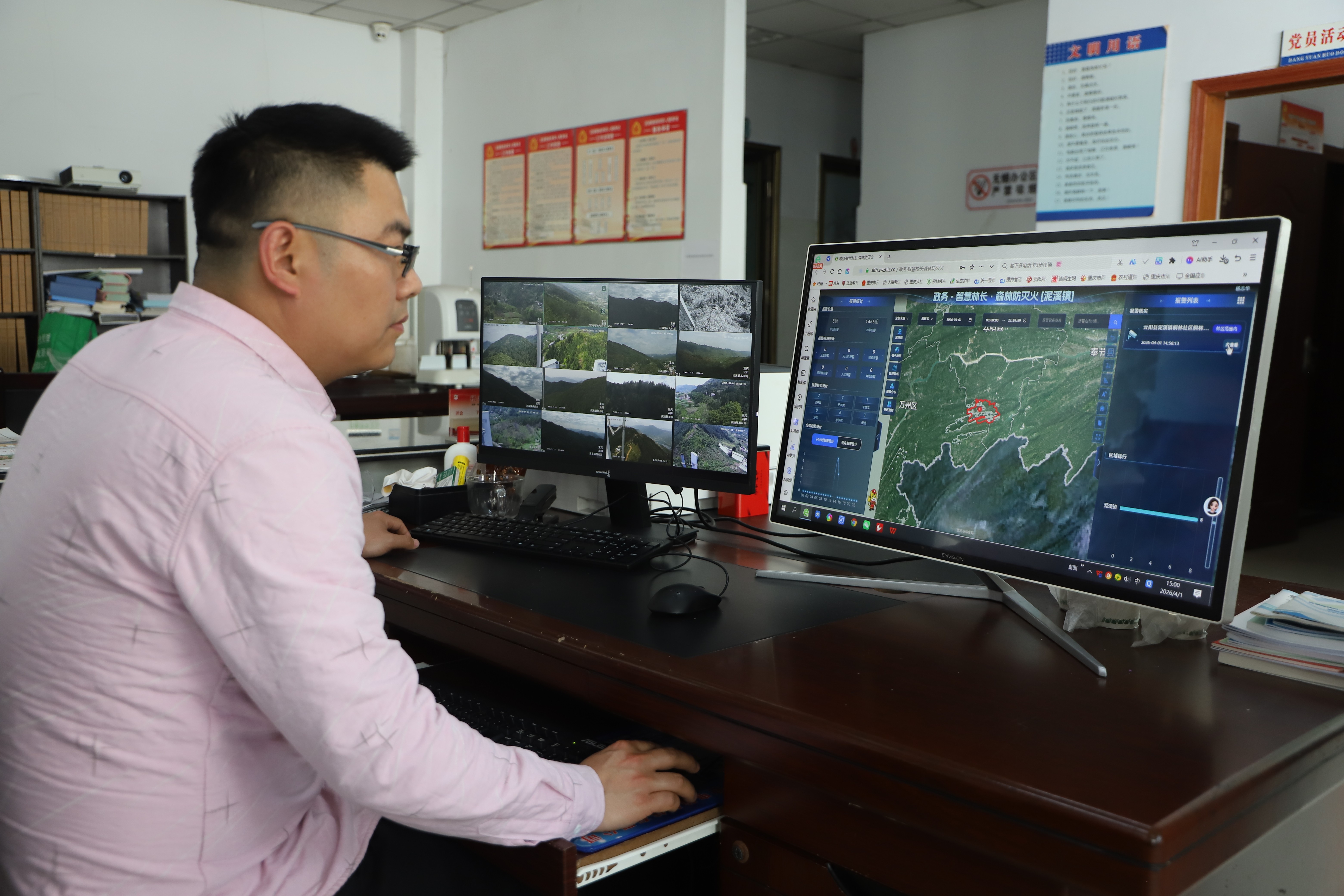 “这是我们依托‘141’基层治理体系搭建的智慧防火平台。”在泥溪镇政府办公室,该镇副镇长姜霖指着屏幕介绍,目前,在配齐镇、村、组三级标准化灭火装备基础上,该镇应急力量还实行常态化带装巡护,一旦发生火情,智慧防火平台能够实现重点林区视频监控全覆盖,火情预警一键直达网格员,做到全天候智能监测、快速响应处置。