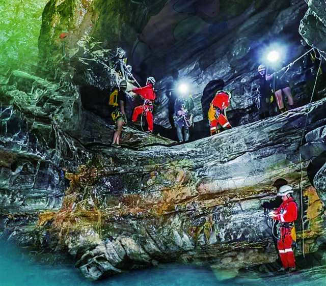 户外运动爱好者在武隆洞穴探险