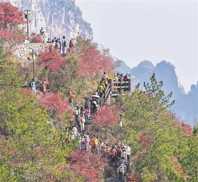 11月29日,巫山县巫峡神女景区,众多游客在红叶相伴的步道上徒步观景。记者 张锦辉 摄/视觉重庆