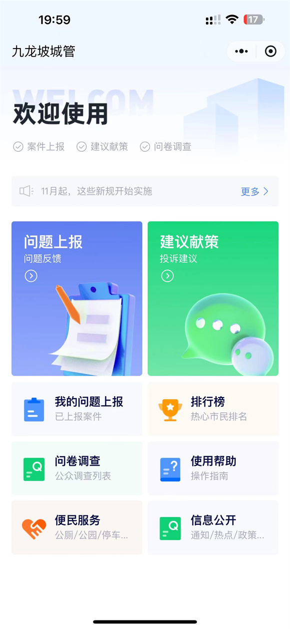 群众“下单”,平台“派单”,职能部门“接单”。在这种模式下,九龙坡区城市管理局快速响应、高效处置,使“随手拍”成为反映、解决城市管理问题的民生服务重要渠道。该小程序不仅可以让市民随时随地反映城市管理问题,还可以对城市管理工作建言献策。同时,该小程序还提供找公厕、找公园、找车位、找饮水点等便民服务,导航一触即达。