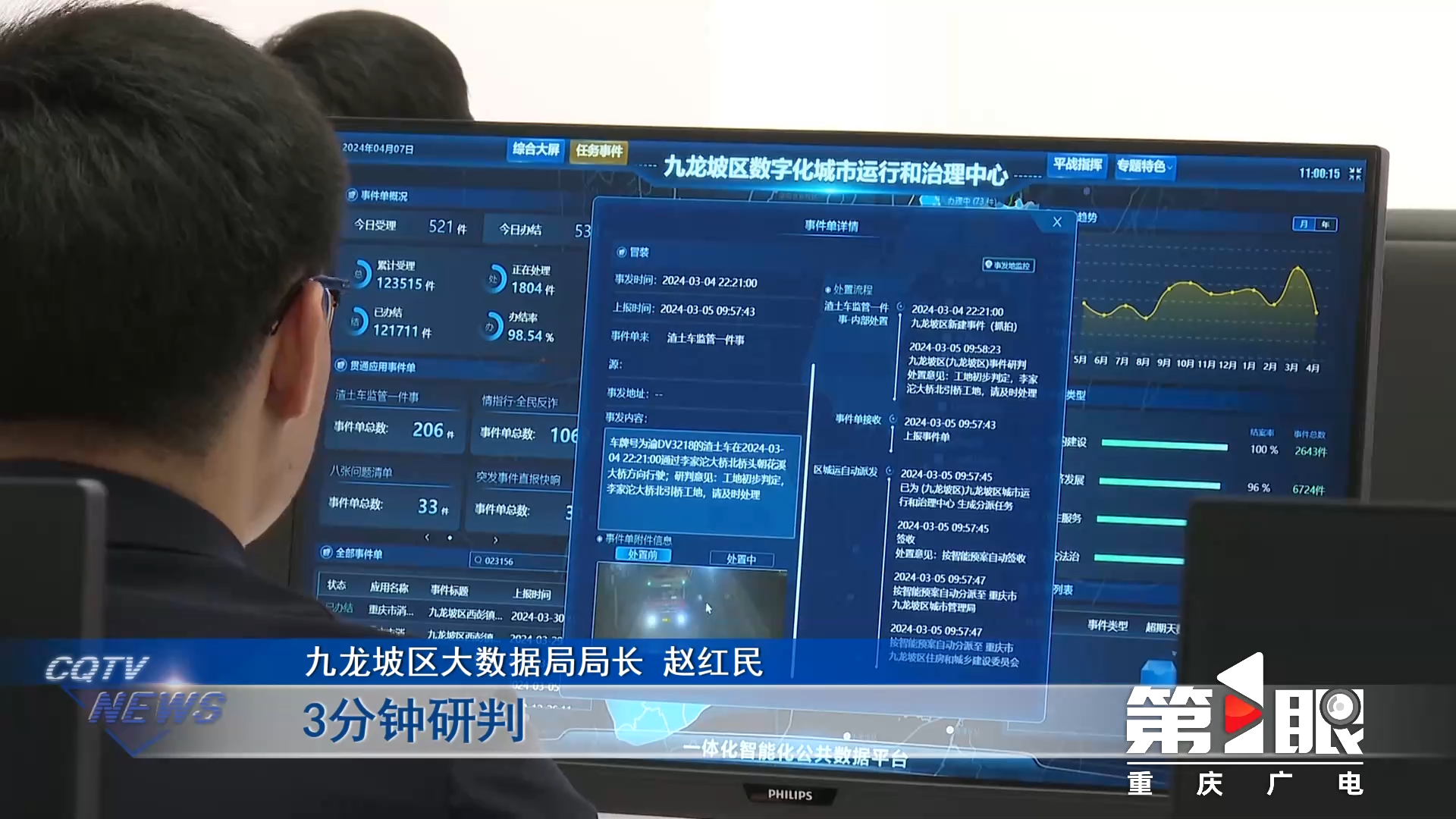 九龙坡区大数据局局长赵红民介绍说,通过整合前端道路摄像头,结合AI算法,感知渣土车违规行为后,会自动生成预警信息上传到应用,后台工作人员研判出渣土车的源头工地。如果跨区了,就会将事件上报至市城运中心进行确认和转派。由系统来锁定所在的镇街,并在渝快政上来选择执法人员现场处置,处置后信息同步返回三级城运中心。整个过程是,0.1秒感知、3分钟研判、毫秒级自动派单、30分钟内响应、7天内处置,以此来形成市、区、街镇三级工作闭环。