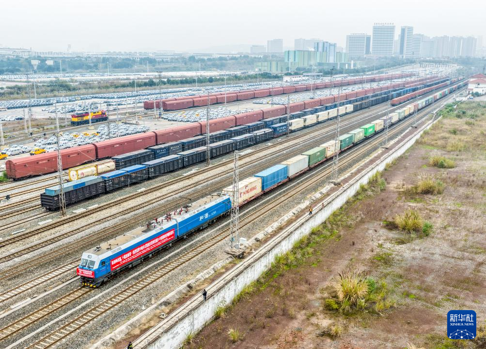 12月15日,中新多式联运示范项目重庆—中亚国际班列在重庆鱼嘴站等待发车(无人机照片)。新华社记者 唐奕 摄