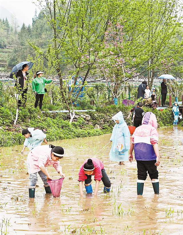 4月5日,巫山县骡坪镇路口村十里花溪,游客在水田中摸鱼。通讯员 王忠虎 何善春 摄/视觉重庆