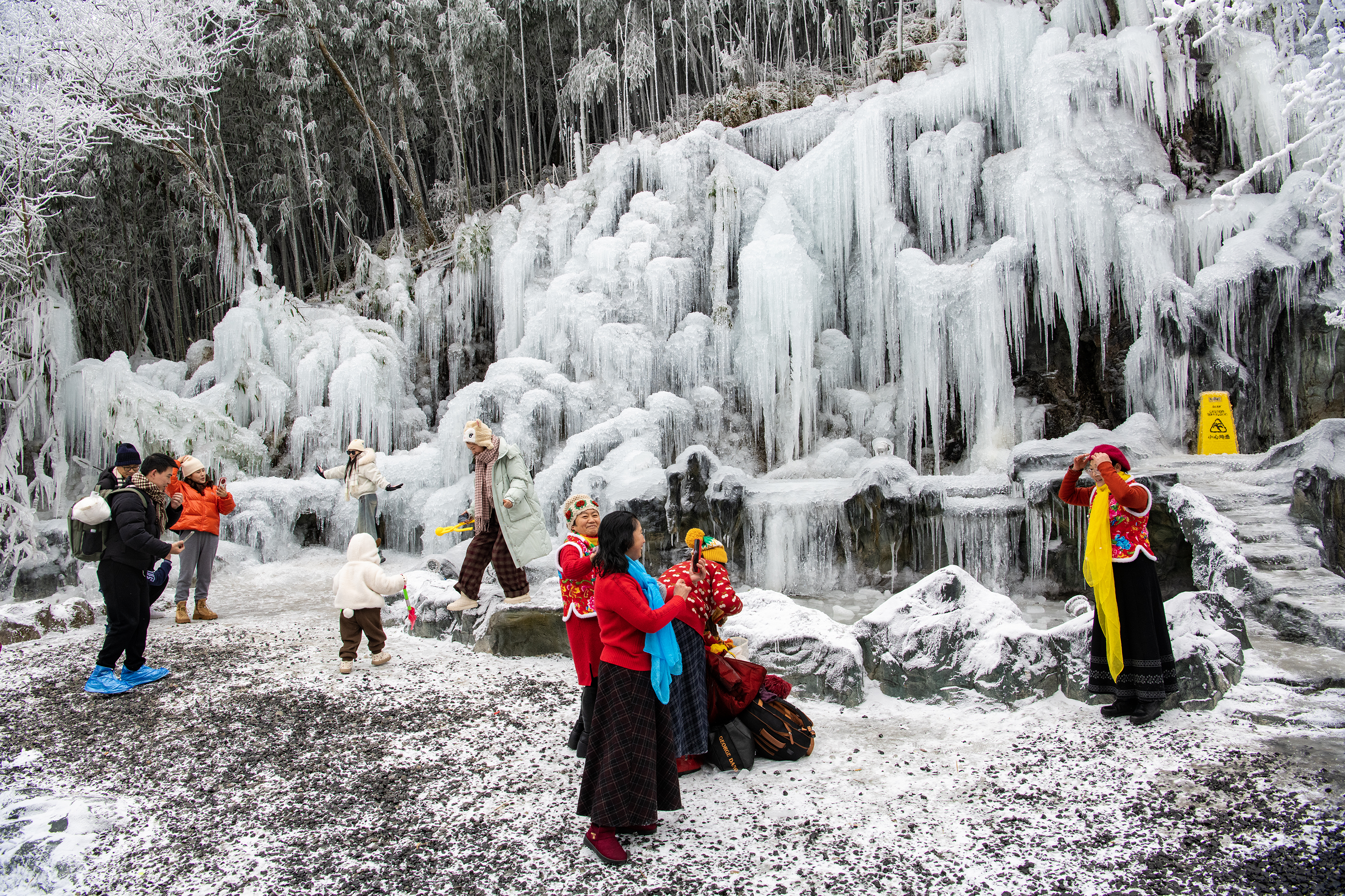 1月5日,南川区金佛山景区观霞台,游客在晶莹剔透的冰瀑下拍照打卡。通讯员 胡波 摄