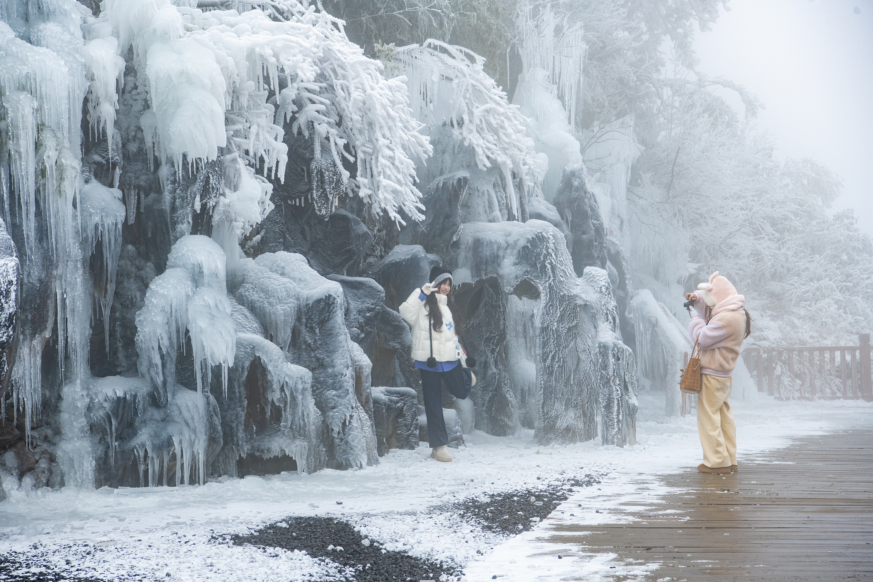 据了解,近来寒潮低温天气,重庆周边的一些高海拔山区出现了霜冻、冰凌等气象。海拔约2100米的金佛山观霞台近期因低温天气形成了长度近100米、高度超5米的冰瀑群,晶莹剔透的冰瀑和雾凇形成了美丽的冰雪景观,吸引了各地游客前来游览打卡。