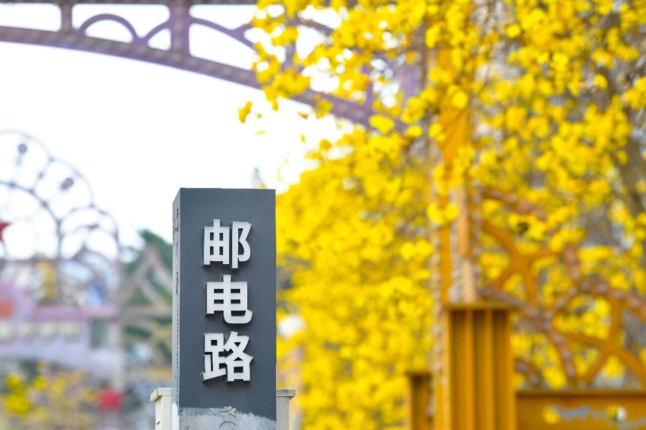 走进邮电支路,抬头望去,道路两旁的黄花风铃木正值盛花期,团团簇簇的金黄色花朵挂满枝头,宛如万千风铃在春风中摇曳,作为一种会随着四季变换风貌的树种。