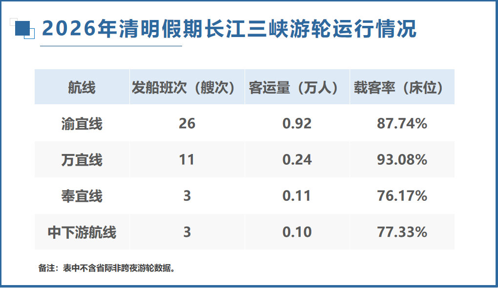 4月9日,来自市港航海事事务中心、重庆航运交易所的数据显示,清明假期4月4日—6日,长江三峡游轮发船47艘次,为2025年清明同期的92.2%;完成客运量1.42万人次,较2025年同期增长8.7%。与去年同期相比,游轮平均载客率(床位)86.8%,较2025年同期上升5.3个百分点,船舶利用率持续提升。