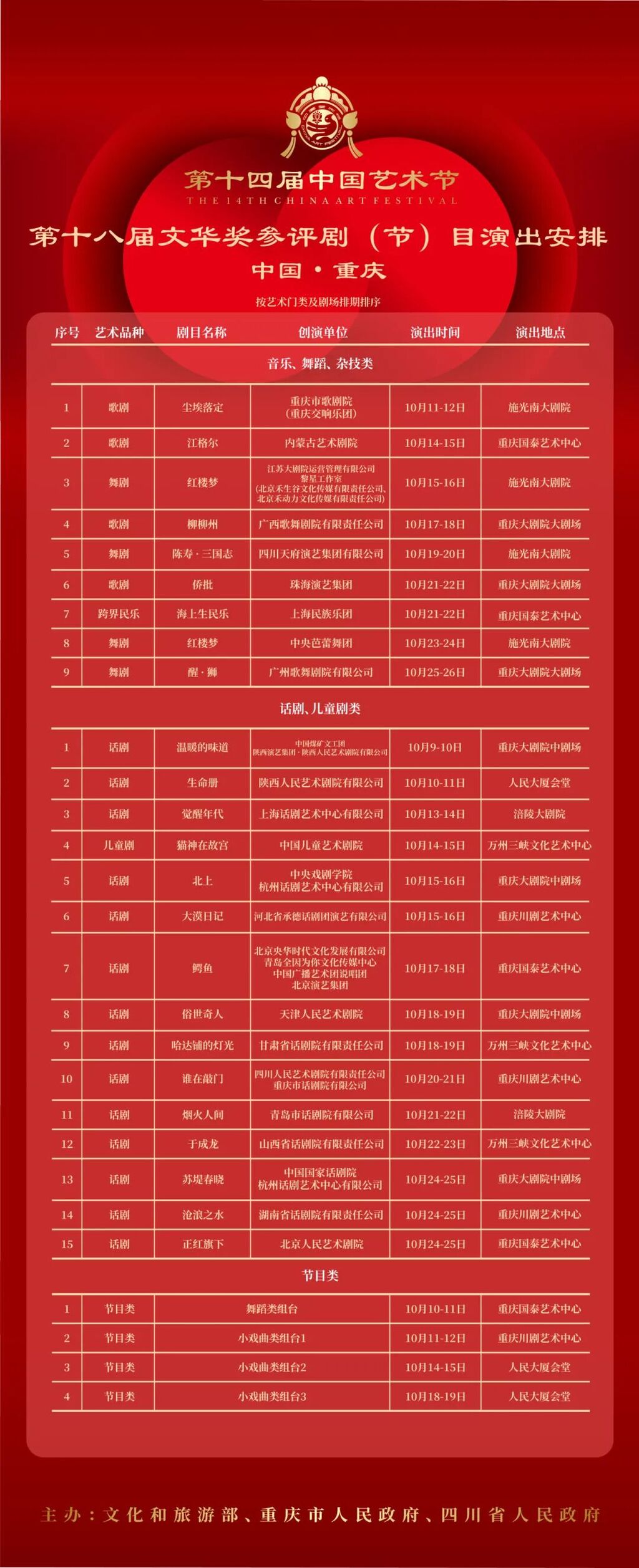 第十四届中国艺术节将在重庆与四川两地联袂举办。作为全国规格最高、规模最大、最具影响力的综合性文化艺术活动,本届艺术节以“艺动巴山蜀水 共绘时代新篇”为主题,由文化和旅游部、重庆市人民政府、四川省人民政府共同主办。