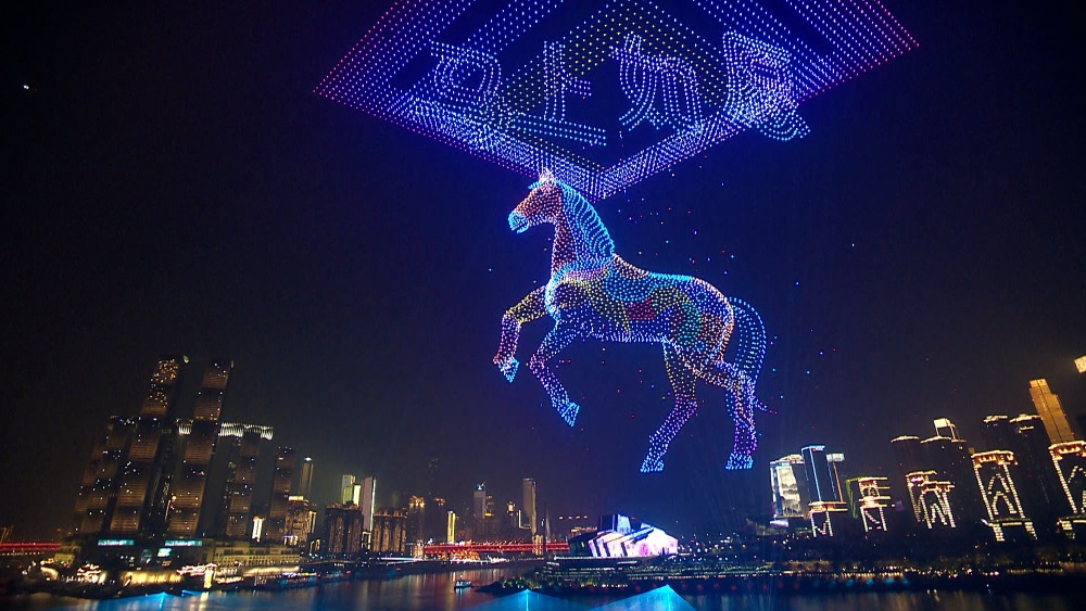 在两江四岸灯光映衬下,无人机编队依次呈现经典图案与马年限定祝福画面,灵动的马形光影、吉祥的新春符号,在夜空中流转变幻,勾起每一位市民的情感共鸣。