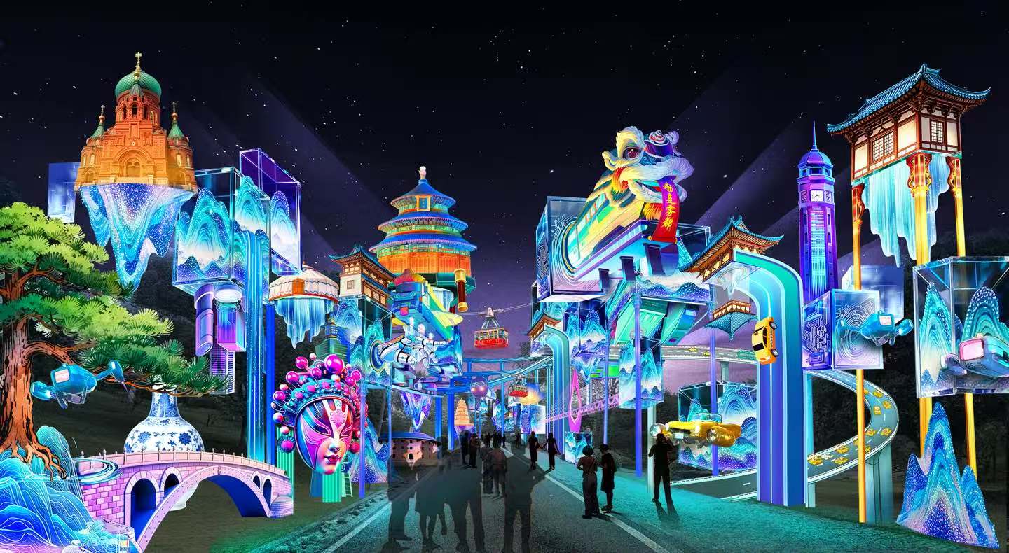 值得一提的是,在本次灯会上,还专门设置了融入重庆方言的趣味打卡点:《马言马语》6系灯组,如丁丁猫(蜻蜓)、猪儿虫、麻老虎等抽象画形式的通道灯组,以幽默、接地气的表达形式,打造具有地域认同感的打卡场景;《万象》灯组采用赛博朋克风格,将我国各个省级行政区的代表性元素(建筑、特产、动物等)融入设计,以“万象更新”为核心,让各地游客都能找到专属记忆点。