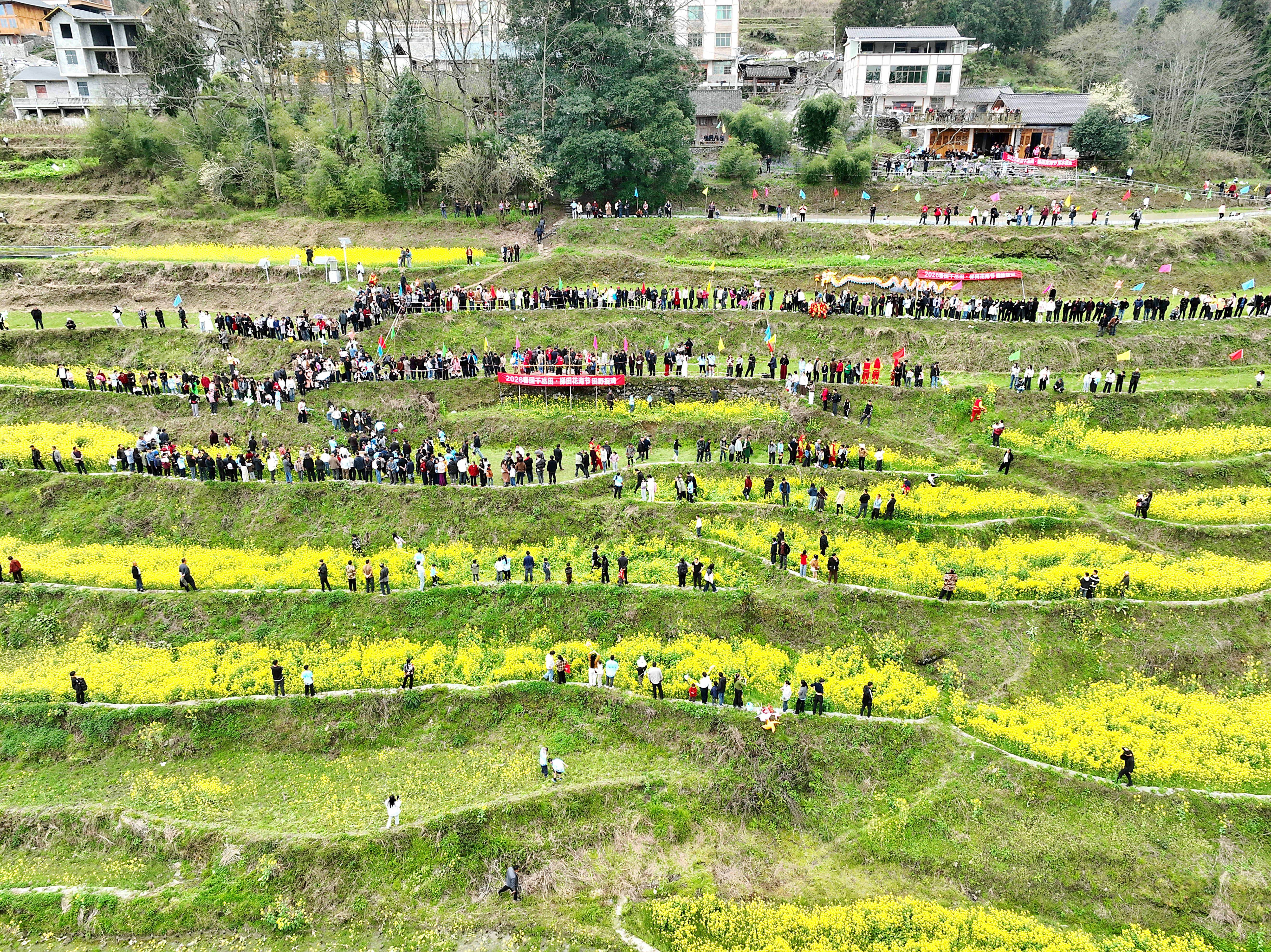 李溪镇官坝村同样举行了赏花节。在千亩油菜花海中,游客观赏舞龙,挑果接力,品味官坝美食,乐享春日盛宴。