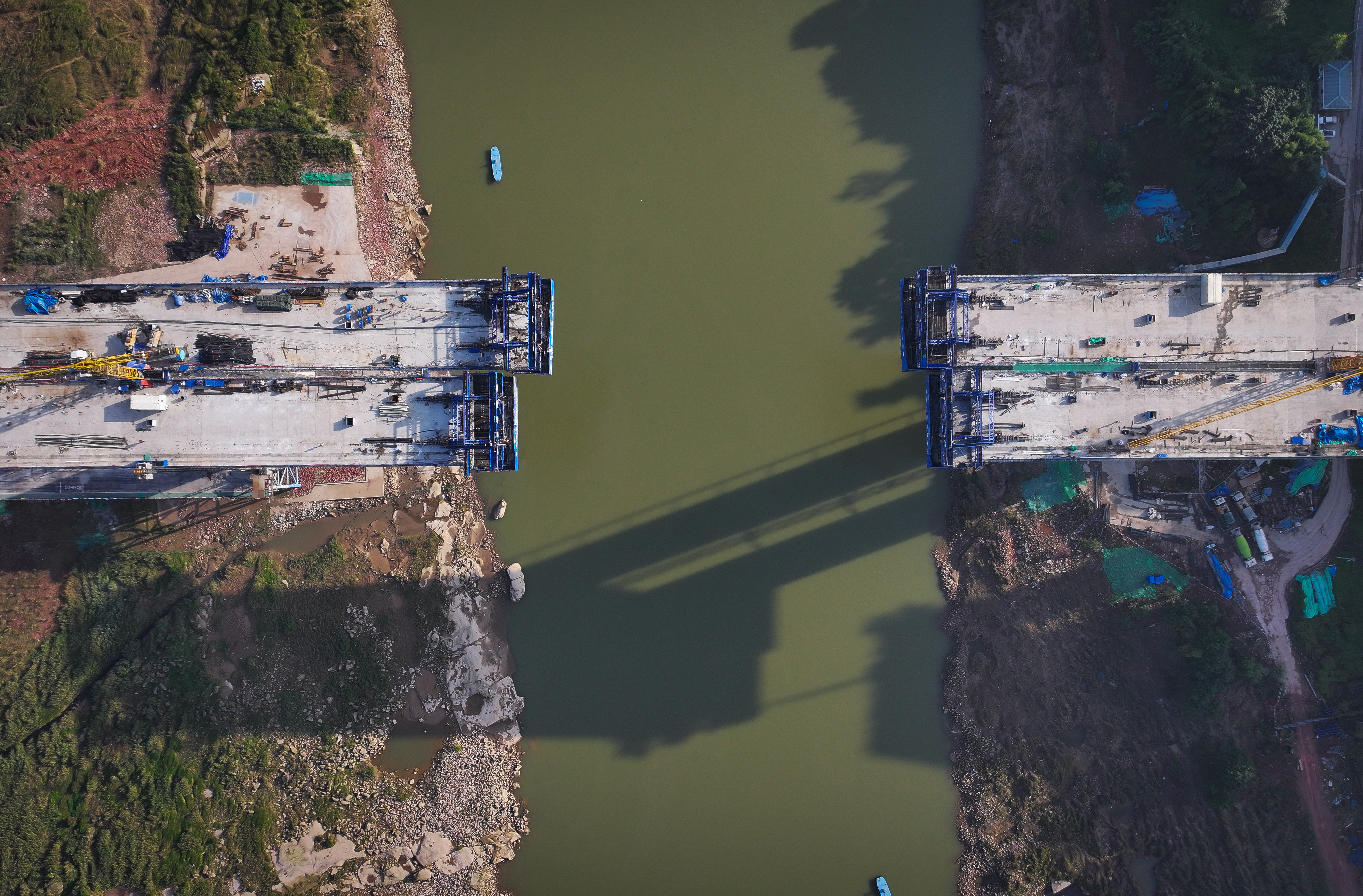 11月25日,重庆宝山嘉陵江大桥项目建设现场,一派忙碌有序的建设景象(无人机照片)。首席记者 龙帆 摄