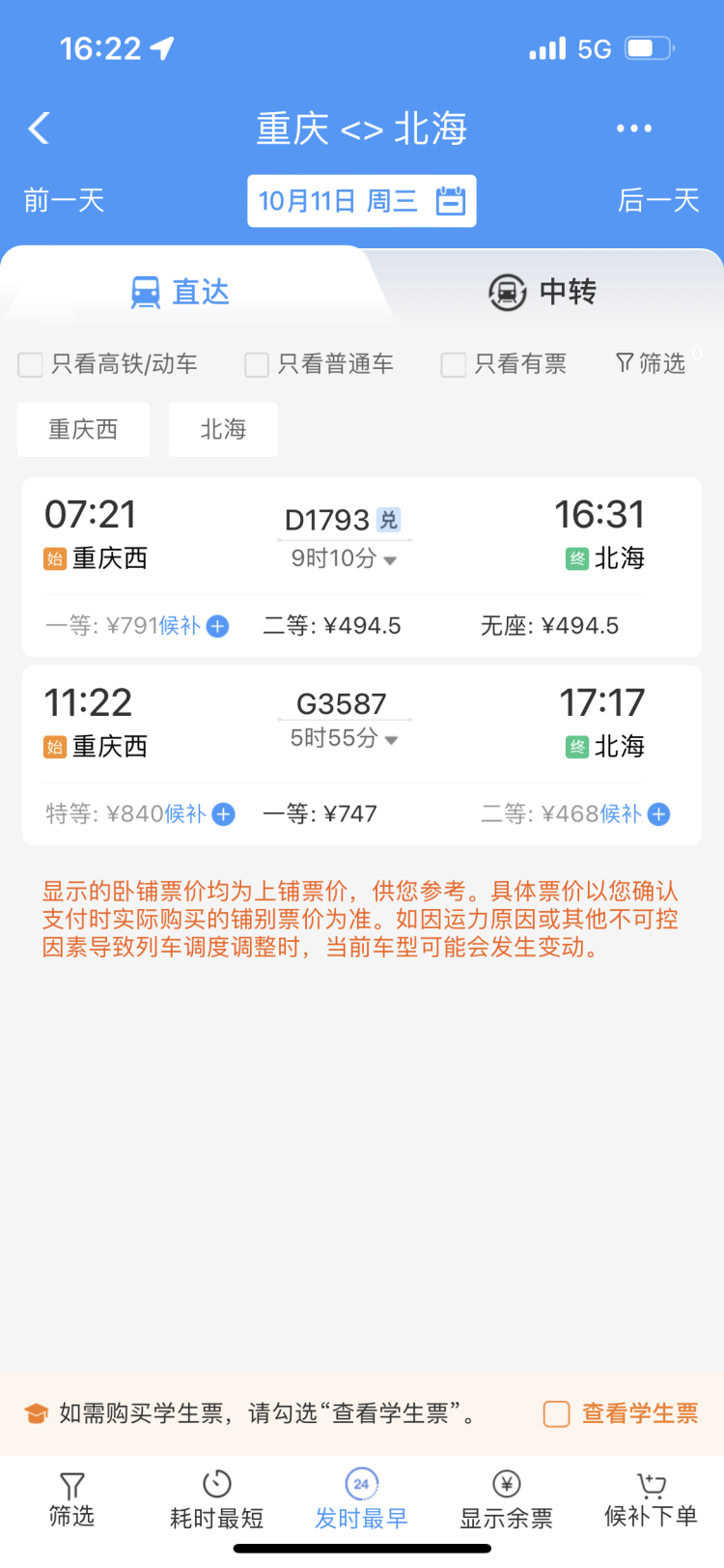 从10月11日起,重庆到北海将新增一趟G3587次高铁列车,11:22从重庆西出发,17:17到达北海,全程运行时间5小时55分钟,比之前快了近3小时。其中,二等座票价468元,这趟列车开通后,不仅时间缩短了,同等座位票价也更便宜。