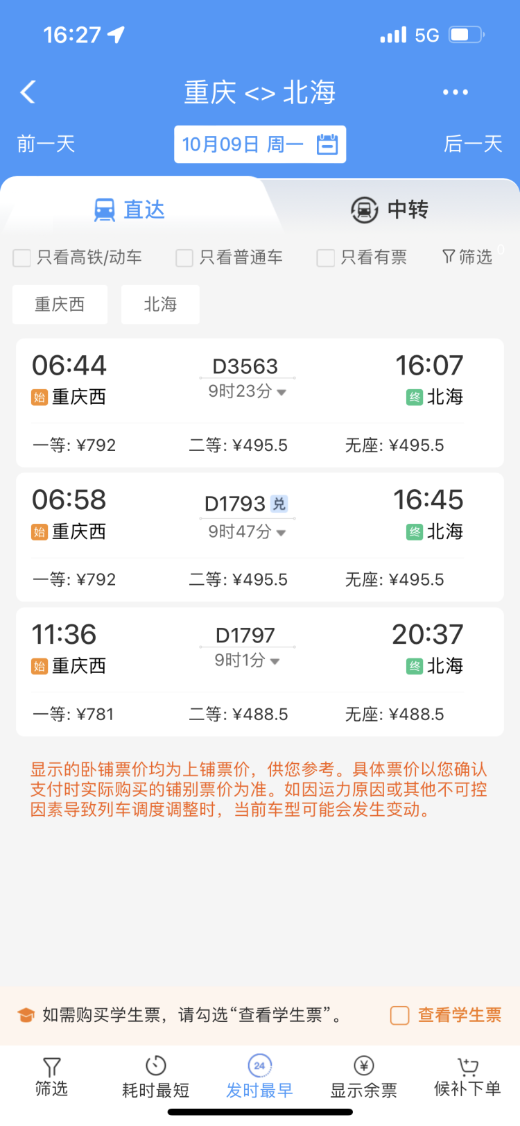 上游新闻记者通过铁路12306查询发现,目前,重庆到北海共有3趟列车,分别是D3563、D1793、D1797次,其中,运行时间最短的是D1797次,全程9小时1分钟,二等座票价488.5元。