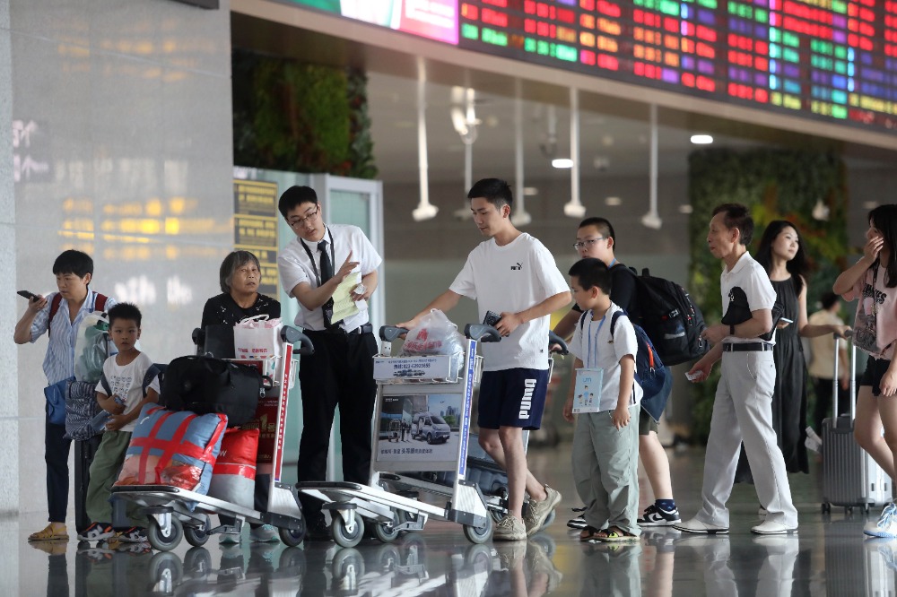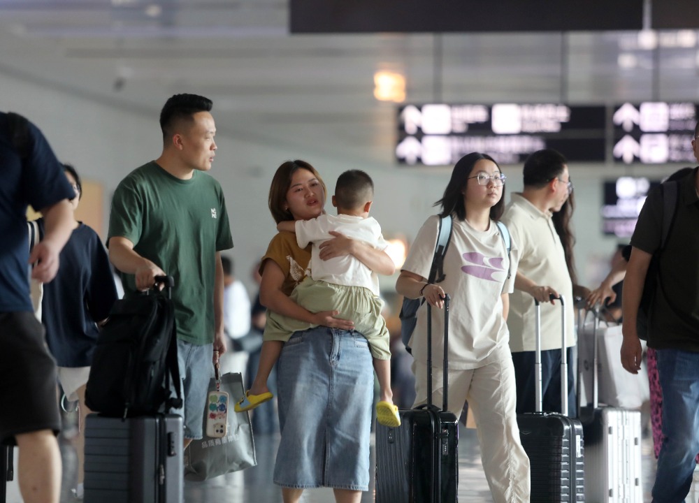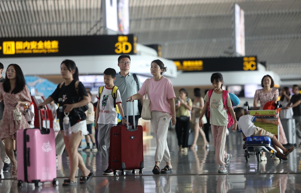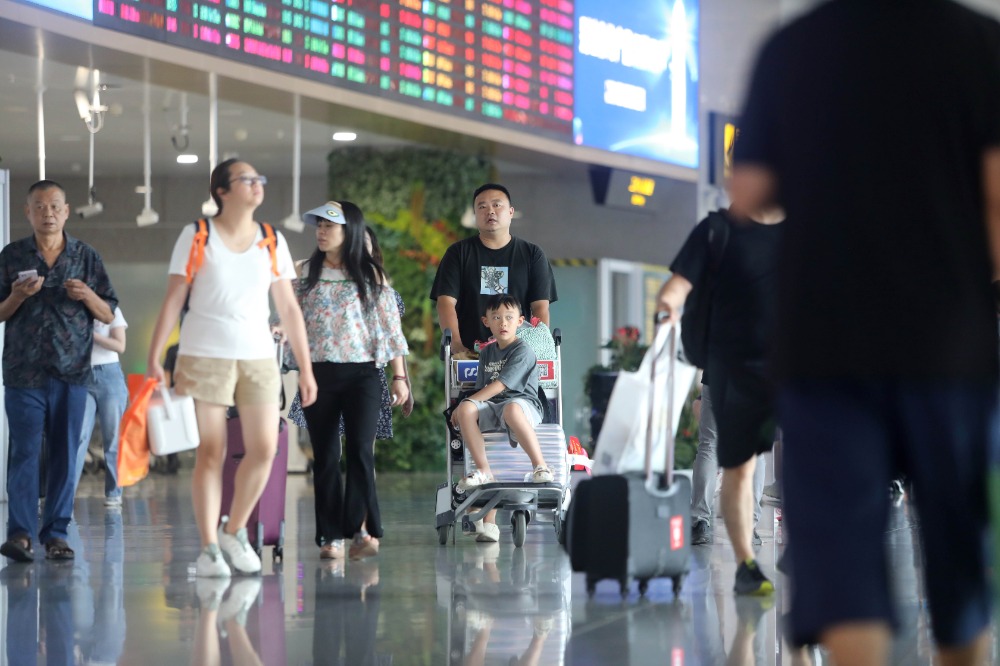 8月30日,重庆江北国际机场出发大厅,众多旅客带着孩子准备登机。记者 罗斌 摄/视觉重庆