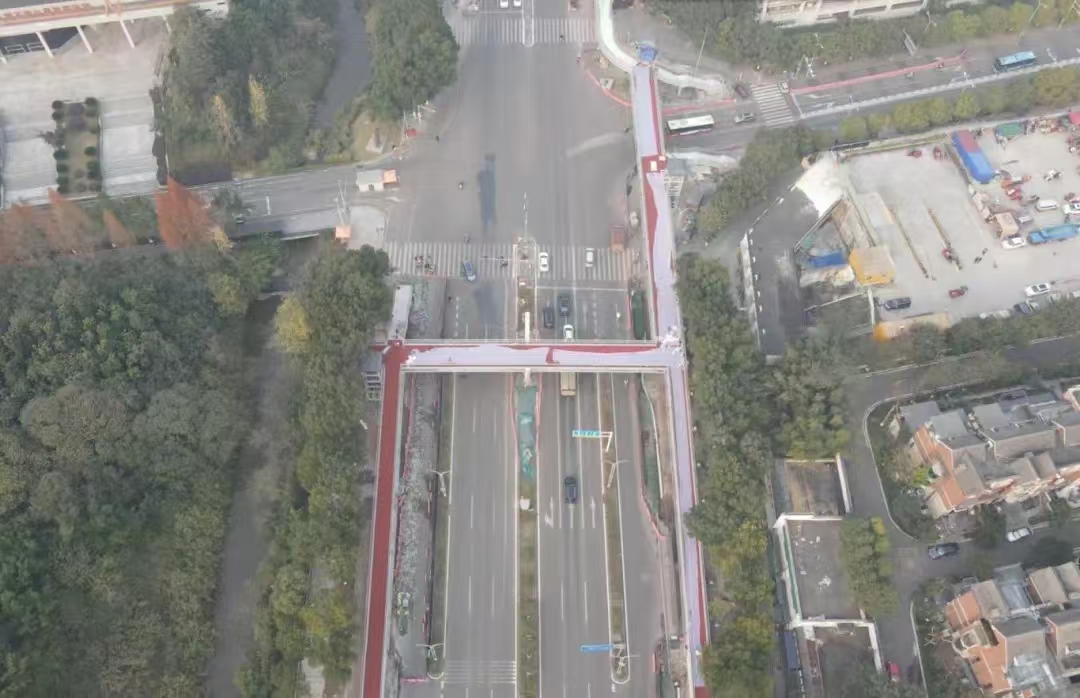 天桥桥梁全长131米,结构呈L型,跨越大学城中路和明德路,两侧接梯道与无障碍坡道。该天桥创新实现道路慢行系统与人行过街设施友好衔接,非机动车辆无需下车推行可直接骑行上桥。