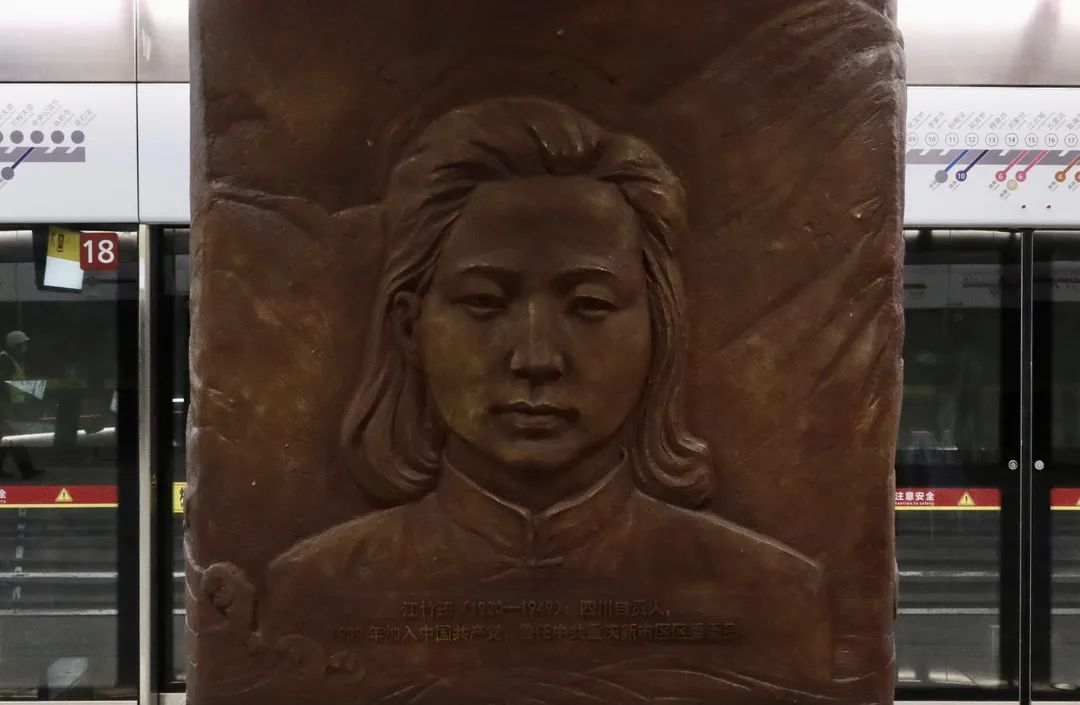 从站厅层下到站台层,在24根立柱的浮雕上,雕刻着的是24位红岩英烈的头像以及介绍,其中包括江姐(江竹筠)、陈然等。