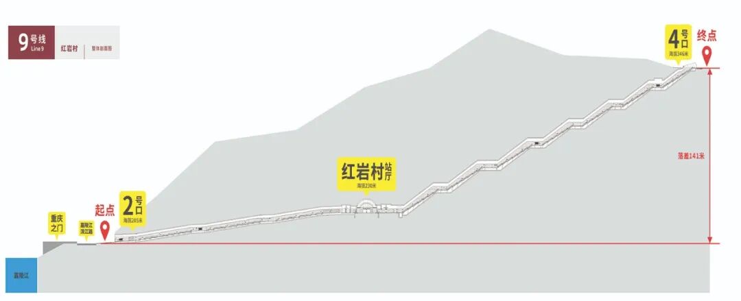 9号线红岩村站位于渝中区与沙坪坝区交界处,车站2号出入口位于下土湾路,4号出入口位于经纬大道,两个出入口一个在山脚,一个在山顶,垂直高差达141米,相当于48层楼,创下国内地铁出入口高差之最。