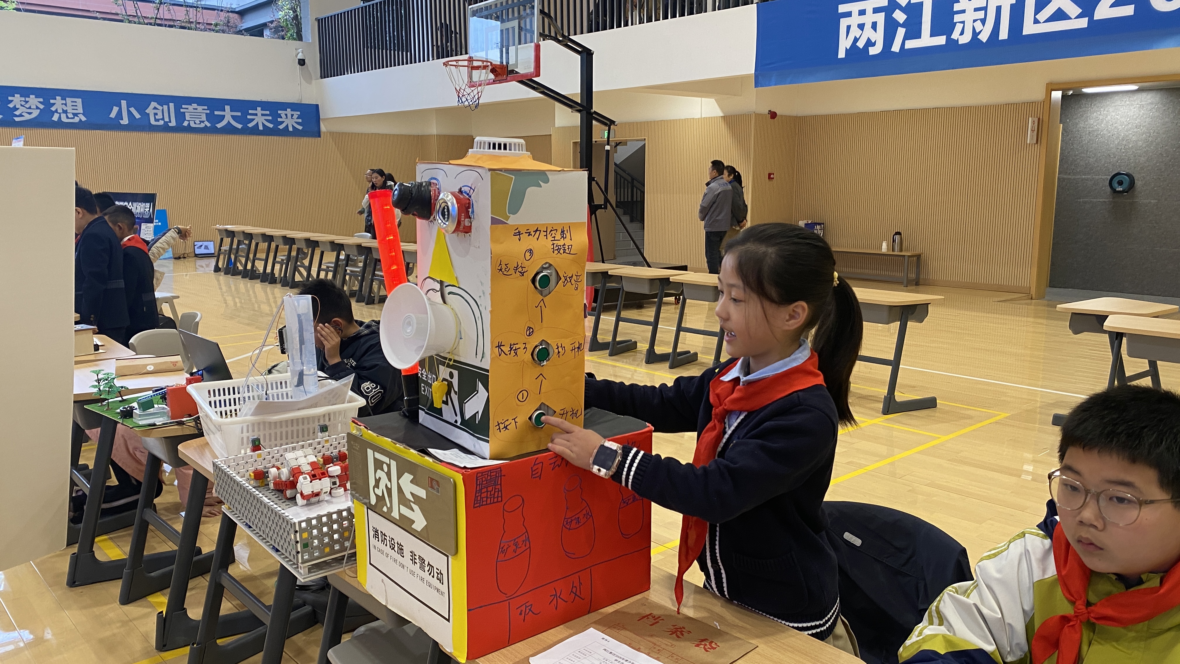 金州小学一名小学生带来的“会救人的小向导——消防疏散机器人”,同样让人眼前一亮。“消防演练时,需要有人引导大家撤离,要等到最后才能离开,这个过程非常危险。所以我想发明一个会发光、会指路的机器人,既能帮大家安全撤离,也不用让人冒险。”这名同学介绍,这款机器人内置烟雾识别装置,当烟雾浓度达到一定程度时,会自动发光、发出警报,提醒大家疏散。