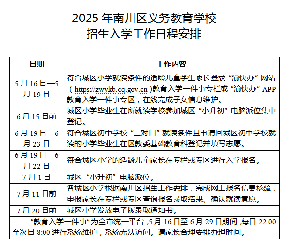 当前位置: 首页>政务公开>重点领域信息公开>教育>教育专题>2025年重庆义务教育阶段招生入学>时间安排