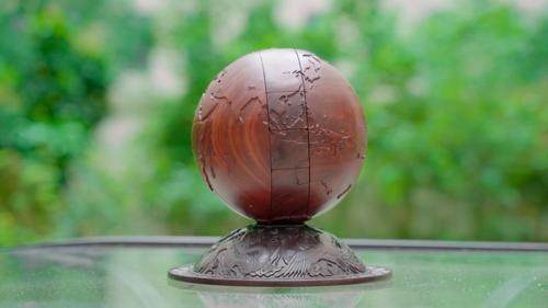 远看是木雕工艺品,近看是地球仪,拿在手中又是可以拆装的“鲁班锁”。